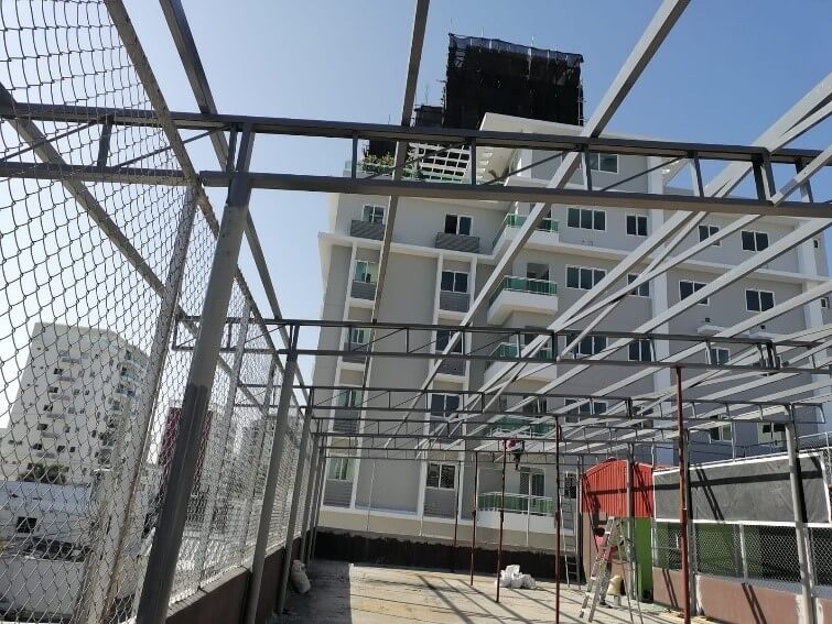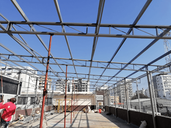 Diseño y Construcción Estructuras Metálicas aligerada techo cancha football sobre 3er piso.